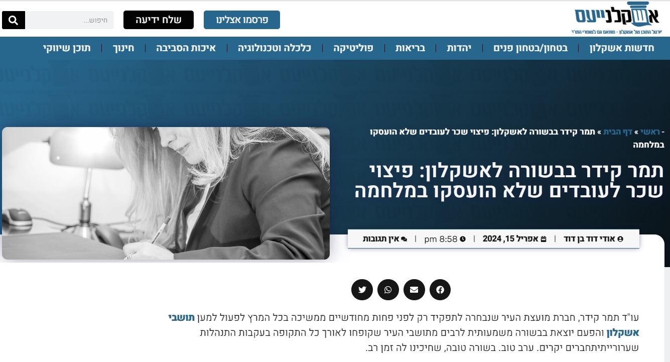 תמר קידר בבשורה לאשקלון: פיצוי שכר לעובדים שלא הועסקו במלחמה